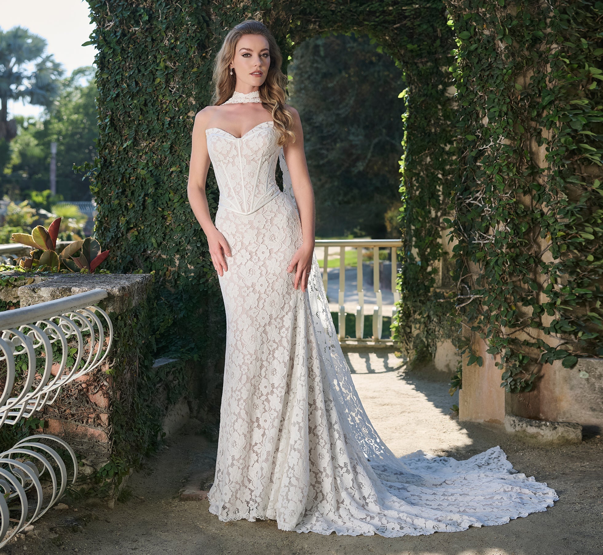 2 piece all over dense lace corset, trumpet skirt, lace scarf.