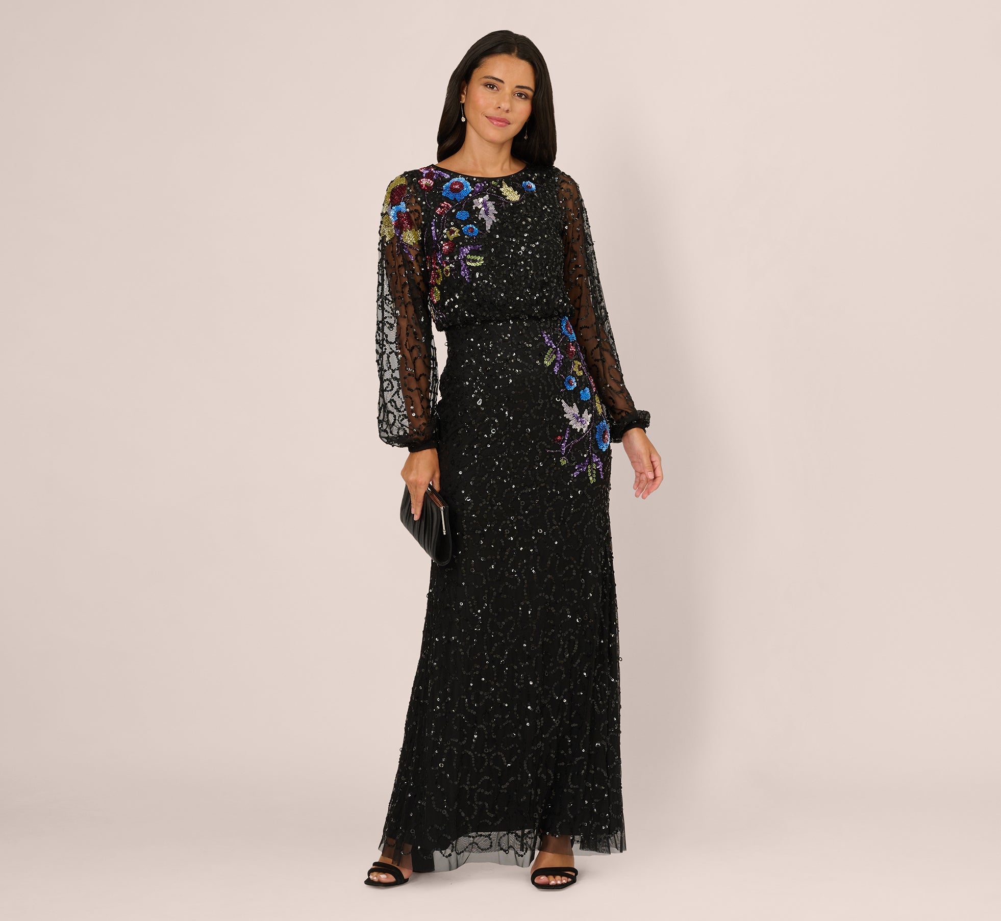 Radiant and artfully adorned, this long sleeve gown is crafted from sheer mesh with allover sequin embellishment that creates a soft shimmer with every step. The mermaid silhouette is shaped with a blouson bodice, while sheer bishop sleeves add a romantic, weightless touch. Colorful floral bead and sequin motifs are placed asymmetrically across one shoulder and hip, offering a bold, painterly contrast against the dark backdrop. A refined choice for black tie weddings, galas, or formal events, this sparkling evening dress will be your go to for elevated elegance.