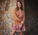 Golden spangles over paisley floral fabric give this short dress its luxe look. The lightweight fabric adds soft volume to the long bishop sleeves and the A line flounce skirt. The bodice is structured with a button front closure and a band collar. The waist is defined with an adjustable tie belt. Perfect for sunny days and casual celebrations, this dress gives you a polished look with a cute boho twist.