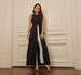 A modern silhouette and bold color blocked fabric make this jumpsuit a statement piece no matter the time of day. This jumpsuit features a sleeveless, fitted bodice with a halter neckline, contrasting wide leg pants, and a long skirt overlay for dramatic effect. Crafted from crepe fabric, this jumpsuit moves with ease, is lightweight, and incredibly comfortable. A hidden zipper closure at the back completes this jumpsuit. Style this jumpsuit for day with a flat or mule. Take it into evening with a beaded clutch and strappy high heels.