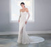 Slim crepe style with fitted bodice decorated with beaded lace with 3D motifs. Solid front bodice with sweetheart neckline, illusion back bodice with exposed boning. Split on the left side front skirt is covered with tulle panel, decorated with beaded lace motifs. Detachable long lace sleeves. Invisible zipper back closure. Long train.