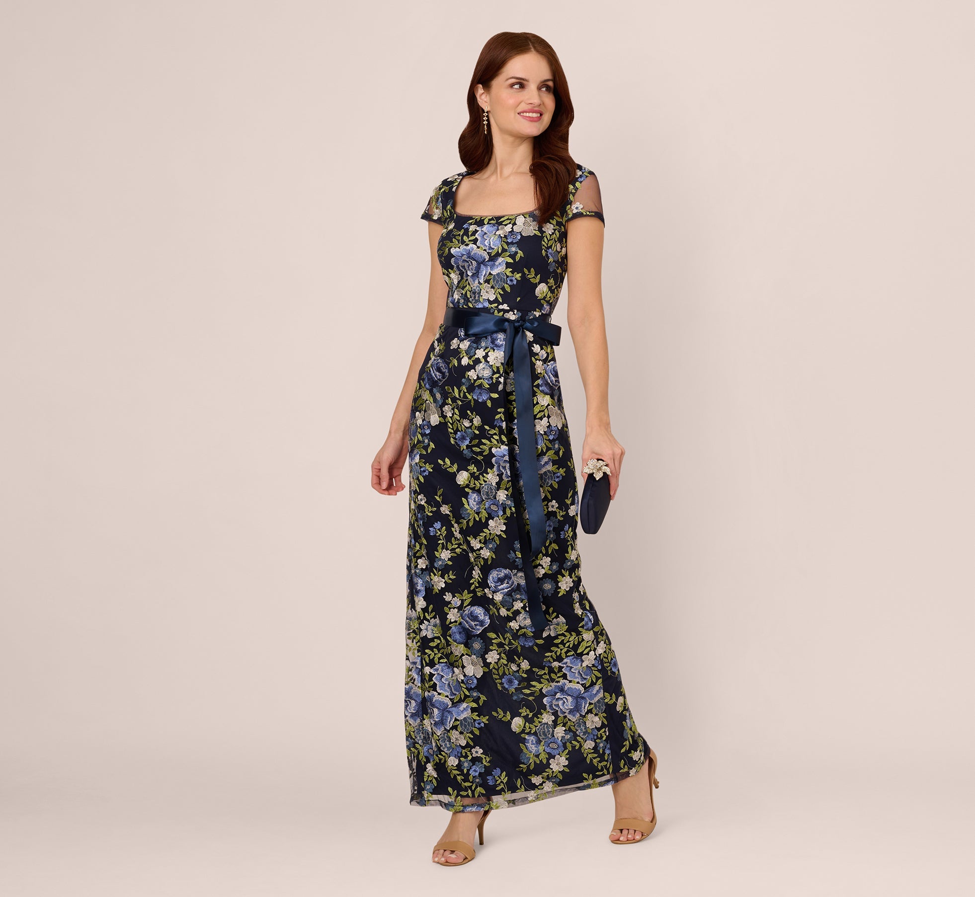 Evoke timeless elegance in this exquisite embroidered floral maxi dress. Featuring a graceful square neckline and delicate cap sleeves, the intricate floral embroidery beautifully contrasts against the deep navy backdrop, creating a look that's both refined and romantic. A satin ribbon belt cinches the waist and defines your silhouette, while the back zipper closure ensures a seamless fit. Perfect for weddings, formal dinners, or special celebrations, this column gown combines classic style with modern detailing.