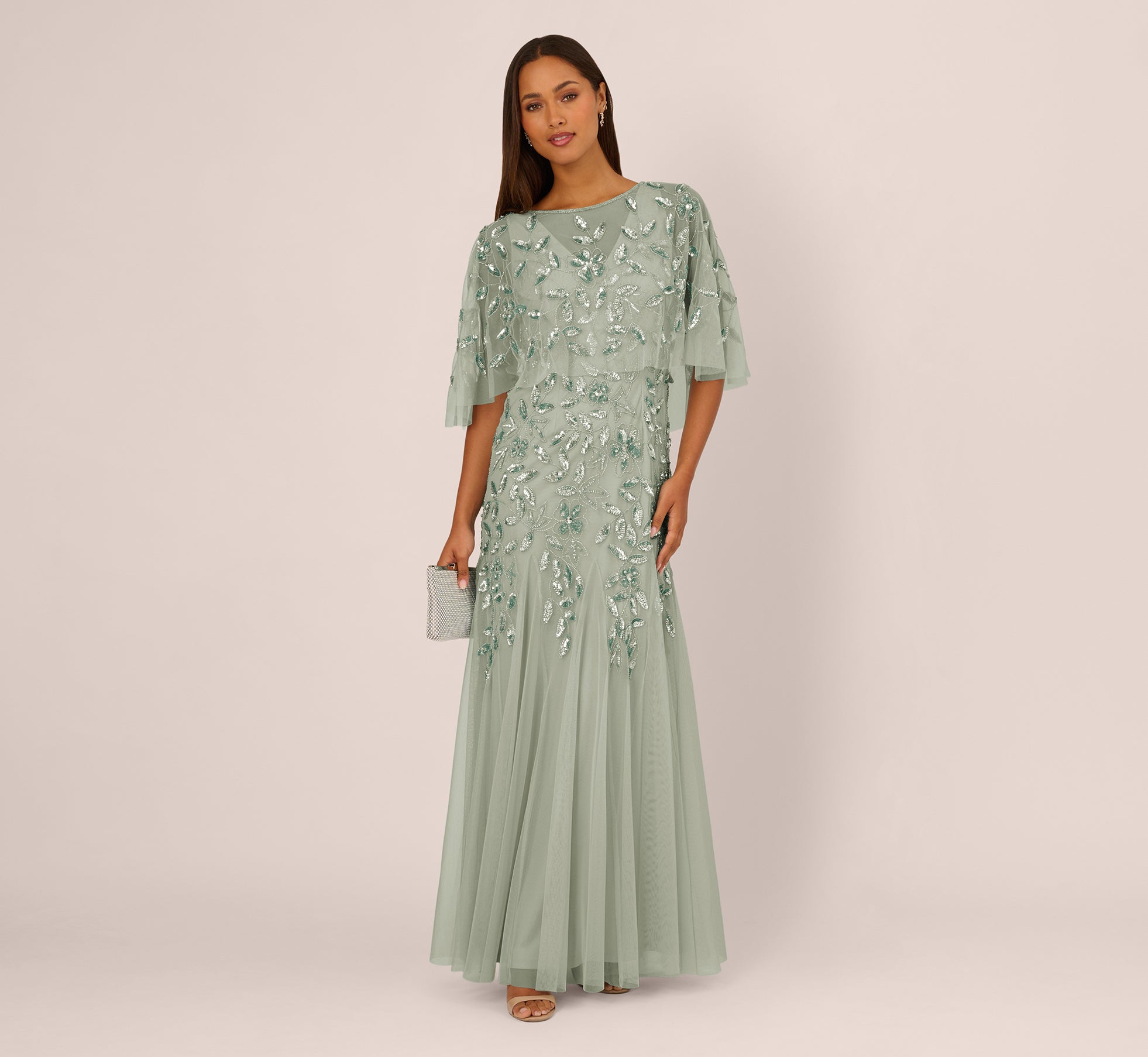 A sweeping silhouette with sparkling detail, this gown delivers timeless elegance with a modern twist. The mermaid cut flows into a soft godet hem, adding graceful movement to every step. Beaded floral embellishments trail from the shoulders to the skirt, creating a shimmering cascade of rich texture. A matching sheer capelet drapes over the bodice, adorned with delicate beading for added dimension. A polished choice for black tie weddings, formal galas, and special celebrations, this evening dress makes a luxe statement anywhere you wear it.