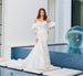 A stunning, floral matte lace has been placed over an all-over chantilly lace on this stunning mermaid gown. The scoop neckline leads to a semi sheer bodice and fitted body that opens up to a dramatic skirt.