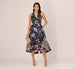 Elegant florals leave their mark on this sleeveless gown. This midi dress features a sleeveless bodice with a surplice neckline that is accented by a fold-over collar. Crafted from floral organza fabric, this dress is fully lined and boasts a high low skirt. A beautiful single ruffle at the frontadds a unique touch. This sleeveless dress is completed by a zipper at the center back. Styled with nude or black heels, this floral dress is an ideal choice for dressy occasions day or night.