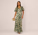 Foil Leaf Short Sleeve Gown With Draped Details In Green Pine Gold