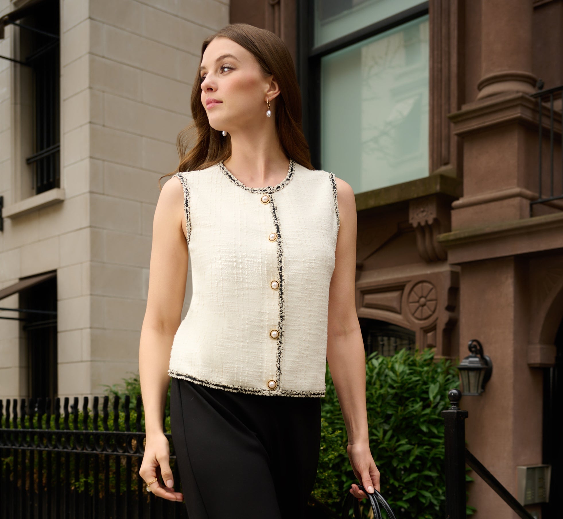 A deconstructed take on prim and proper suiting, this knit vest softens the look with an easy fit and contrast fray trim. The tweed fabric construction adds classic texture and metallic buttons down the front finish the design with a luxe touch. Give any ensemble a polished and put together feel with this cute sweater vest.