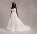 Soft and romantic, this classic A-line ballgown takes a dreamy modern twist on tradition with a touch of color. The semi sheer bodice is adorned with artisanal blossoming three-dimensional floral appliqués that trails past the natural waist and strategically placed around the skirt. The skirt is made of layers of tulle that has dramatic gathers at the back and created a full sweeping train.