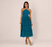 This midi dress features a strappy halter neck that adds a touch of glamour to the classic fit-and-flare design. The knit bodice provides a comfortable and flattering fit, while the tiered mesh skirt overlay adds soft dimension and romantic style. Complete with a back zipper, this dress is perfect for girls' night, date night, and parties.