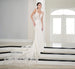Romantic lace has been used to cover the semi sheer bodice on this modern and sexy, slim gown. The lace is placed as 3D flowers on the straps that lead to a stunning, low and sexy back bodice that opens and closes with buttons and loops. The fitted skirt is made of stretch crepe and is finished with a dramatic and long, statement making train.