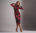 Sleek, striking, and made to turn heads, this long sleeve midi dress features a fitted bodycon silhouette with a mid calf hemline and a thigh high slit. The mesh fabric is printed with a vivid floral motif and touched with metallic accents for added dimension. Ruched princess seams create sculpted texture down the front and a mock neck collar with pleated details completes the look. A fresh and modern look for cocktails and parties, this dress stands out for all the right reasons.