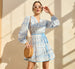 Cute and sunny, this short blue and white dress features a classic eyelet lace fabric that gives the design soft texture. A flounce skirt, bishop sleeves, and a button-front bodice create a modern and romantic silhouette. The waist is defined with stretch elastic as well as a delicate satin ribbon belt. Perfect for picnics in the park and days out on the town, this pretty long sleeve dress is sure to be a warm weather favorite.