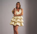 This party ready cocktail dress is crafted from gleaming metallic jacquard fabric for a luminous shimmering finish. Designed in a playful fit and flare silhouette, it features a deep V neckline, princess seams that shape the bodice, and a voluminous three tiered flounce skirt. A fresh and fun choice for celebrations, dinners, or nights out, this dress is the perfect look for making an entrance.