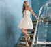 This fashion forward, short and flirty dress features a plunging neckline that has been finished with self-bows. The skirt has a dropped waist with lightly gathered, full sides and dramatic volume.
