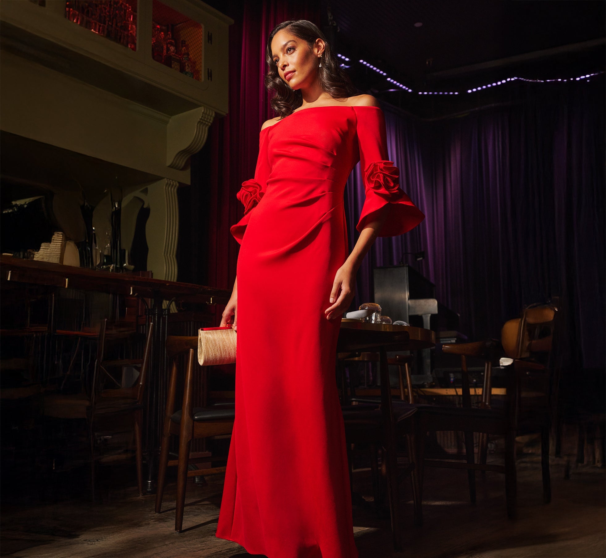 Sleek scuba crepe fabric gives this aqua gown its soft but structured look and feel. The offthe-shoulder bell sleeves are finished with matching rosette details at the cuff for a romantic touch. A back zipper closure ensures a fitted mermaid silhouette, with ruching at the waist for added depth and dimension. This elegant gown is the ultimate in evening sophistication, perfect for special occasions and big events.