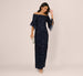 Make a stunning entrance in this elegant blue off-the-shoulder gown. The refined column dress design is crafted from shimmering sequin lace fabric. The bell sleeves, adorned with a soft organza underlay, add a touch of romantic drama to the look. A discreet back zipper closure ensures a seamless fit, making this dress perfect for formal occasions or evening galas.