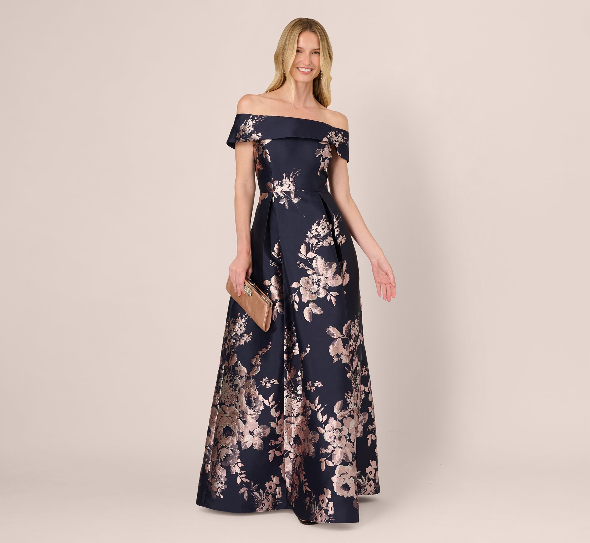 A modern classic with timeless appeal, this striking gown features a fit and flare silhouette, tailored with princess seams through the bodice and a full, pleated skirt for graceful movement. The rich metallic jacquard is woven with a bold floral motif that catches the light with every step. Framed by a foldover off the shoulder neckline, this polished look is finished with convenient side pockets. Turn heads at your next formal event or big celebration in this glamorous evening dress.