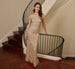 Beautiful all over sequin beading shines on this pretty evening gown. This formal dress features an off the shoulder neckline, a fitted bodice, a no seam waist (so flattering) and a soft, long skirt with slightly flared hem and a modified train. Paired with peep toe pumps, this sparkling dress is complete.