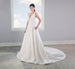This showstopper of a gown is made of pearl studded Mikado and is sure to turn heads. This fresh gown features a plunging neckline, a modern, pleated waistband and a full A-line skirt. The back bow is fully detachable.