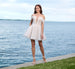 Pearl studded tulle makes up this flirty and fashion forward short gown. A semi-circle cut mini skirt is made up of layers of tulle. The draped off the shoulder is detachable to show a strapless neckline.
