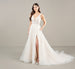 This dreamy gown features a semi sheet bodice adorned with embroidered appliqué that trails past the natural waist. Featuring a plunging neckline with illusion insets at center front. The A-line skirt is made of layers of soft tulle, side seam pockets, front slit and sweeping train.