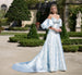 Pointed neckline, modified A-line gown with double princess seam detail and detachable sleeve.