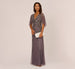 Romantic beading elevates this evening gown. This formal dress features a deep v-neckline, fitted bodice, and sheer cape sleeves. Lined through the body, this dress has a mesh overlay covered in an array of sequin beaded designs, including 3D florals, that accentuate the figureand add drama. A zipper closure at the center back completes this cape dress.