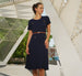 Polished but effortless, this midi dress is made with textured waffle weave knit fabric for a softly structured look. Cut in a smart fit and flare silhouette, the short sleeves and below the knee hemline keep the dress comfortable and easy to wear. Delicate fringe detailing trims the cuffs and the hem. The faux pocket details at the chest and the hips are finished with metallic buttons for a luxe touch. This dress matches comfort with sophistication for an easy office ensemble or refined weekend style.