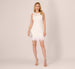 Pretty meets trendy in this elevated floral lace dress. This sheath dress features a halter bodice with sheer neckline, a fitted silhouette, and feather trim at the skirt. Crafted from floral lace, this dress is partially lined through the body and is a beautiful look for a party or as a bride-to-be dress. A sheer back with zipper closure at the center completes this sleeveless lace dress. Style this little white dress with neutral accessories for a look that's as versatile as the places you'll go in this feather-trimmed dress.
