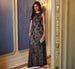 Delicate yet dramatic, this floor length gown stuns with its soft A line silhouette and intricate detailing. Crafted from romantic lace fabric, it's adorned with scattered sequin embellishment and dimensional paillette flower accents that catch the light from every angle. The boat neckline and narrow shoulders lend an elegant, statuesque feel, perfect for formal evenings when you want to sparkle with subtle glamor.