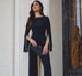 Tailored with clean lines and a touch of embellishment, this knit crepe jumpsuit brings understated drama to evening looks. The wide leg silhouette offers a fluid, elongating shape, balanced by a structured bodice and a graceful boat neckline. The long sleeves are split to reveal a trail of faux pearls, adding a subtle shimmer and a hint of movement with every gesture. Perfect for cocktail receptions, formal dinners, or evenings that call for something beyond the expected, this one piece delivers polish with personality.