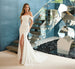 Stretch crepe has been draped beautifully over the neckline in a fashion forward cowl detail that leads to an off the shoulder drape. The front bodice has encased boning detail, sheer sides and a sheer back that is covered with lace applique. The bodice has a dropped, basque detail and the skirt is lightly draped with a sexy slit.