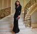 Menswear-inspired details add a tailored look to this evening gown. This formal dress features a faux-wrap bodice flanked by a charmeuse collar, draped details, long sleeves, and a mermaid skirt. Crafted from knit crepe fabric with some stretch for a comfortable fit, this dress has nowaist seam making it easy to wear for any body type. A zipper back closure completes this long sleeve gown. Styled with neutral heels and sparkling earrings, this dress is an elegant choice for a formal occasion or black-tie wedding.