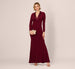 Menswear-inspired details add a tailored look to this evening gown. This formal dress features a faux-wrap bodice flanked by a charmeuse collar, draped details, long sleeves, and a mermaid skirt. Crafted from knit crepe fabric with some stretch for a comfortable fit, this dress has nowaist seam making it easy to wear for any body type. A zipper back closure completes this long sleeve gown. Styled with neutral heels and sparkling earrings, this dress is an elegant choice for a formal occasion or black-tie wedding.