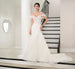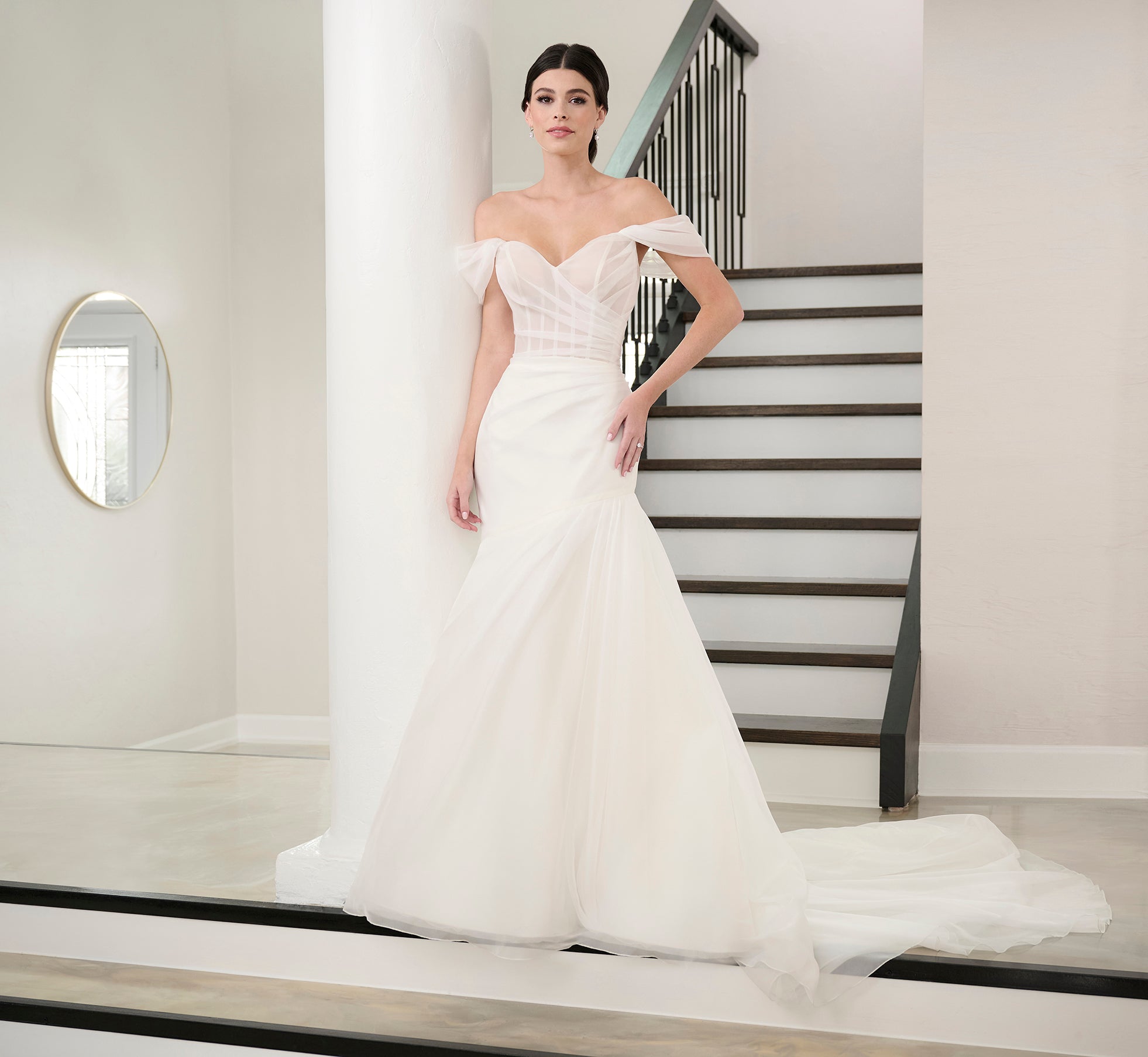 This stunning and special gown is made up of a custom, watercolor printed organza. The organza flatters as it drapes across the bodice with and off the shoulder detail. The slim skirt has an asymmetrical skirt seam that leads to a full mermaid shape. This lightweight gown is the perfect combination of romantic and show stopping. Available in Blush Multi, Green Multi and solid Ivory.